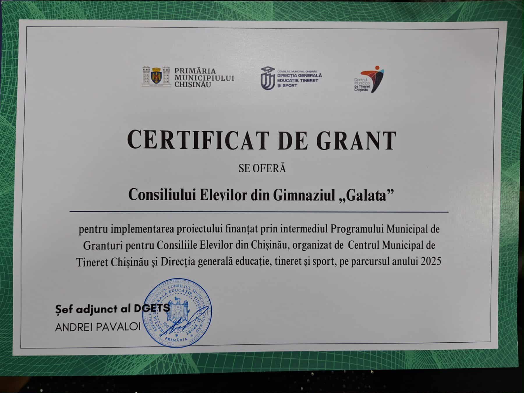 Consiliul Elevilor Gimnaziul Galata, ghidați de coordonatorul Ana Golovei, au câștigat un grant de 10 000, finanțat prin intermediul Programului Municipal de Granturi pentru Consiliile Elevilor din Chișinău.
